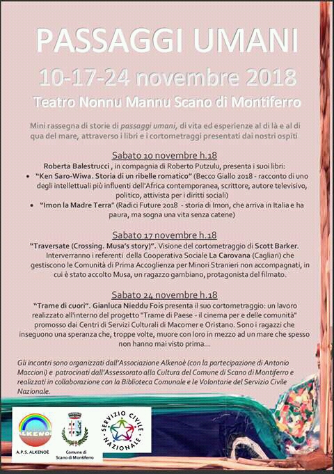 05/11/2018 - Ufficio Del SindacoAlkenoè vi invita a partecipare a Passaggi umani , al Teatro Nonnu Mannu di Scano di Montiferro: 3 incontri per conoscere alcune storie di persone al di là e al di qua del mare.