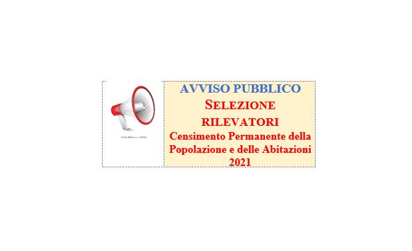 04/06/2021 - Ufficio DemograficoCon Determinazione n. 9/242 del 04.06.2021 è stato pubblicato sull'Albo pretorio dell'ente l'avviso pubblico per il reclutamento di nr. 3 rilevatori ISTAT da impiegare in occasione del Censimento Permanente della popolazione e delle abitazioni - anno 2021 e per le indagini multiscopo indette periodicamente dall'ISTAT.