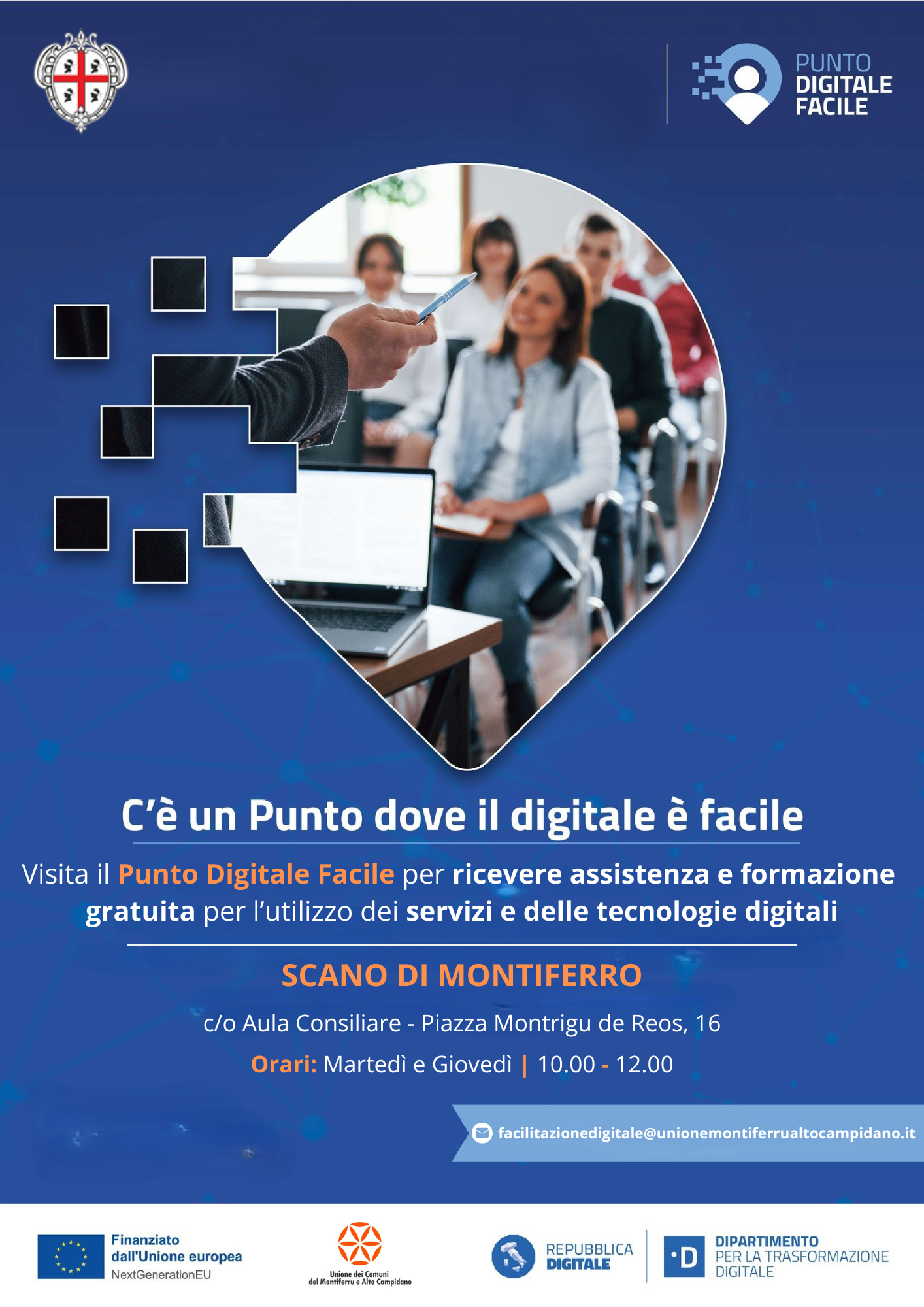 A Scano di Montiferro il punto di facilitazione digitale ha sede nell'aula consiliare del Comune e sarà attivo, a partire dal 08/04/2025, il Martedì e il Giovedì dalle ore 10:00 alle ore 12:00.