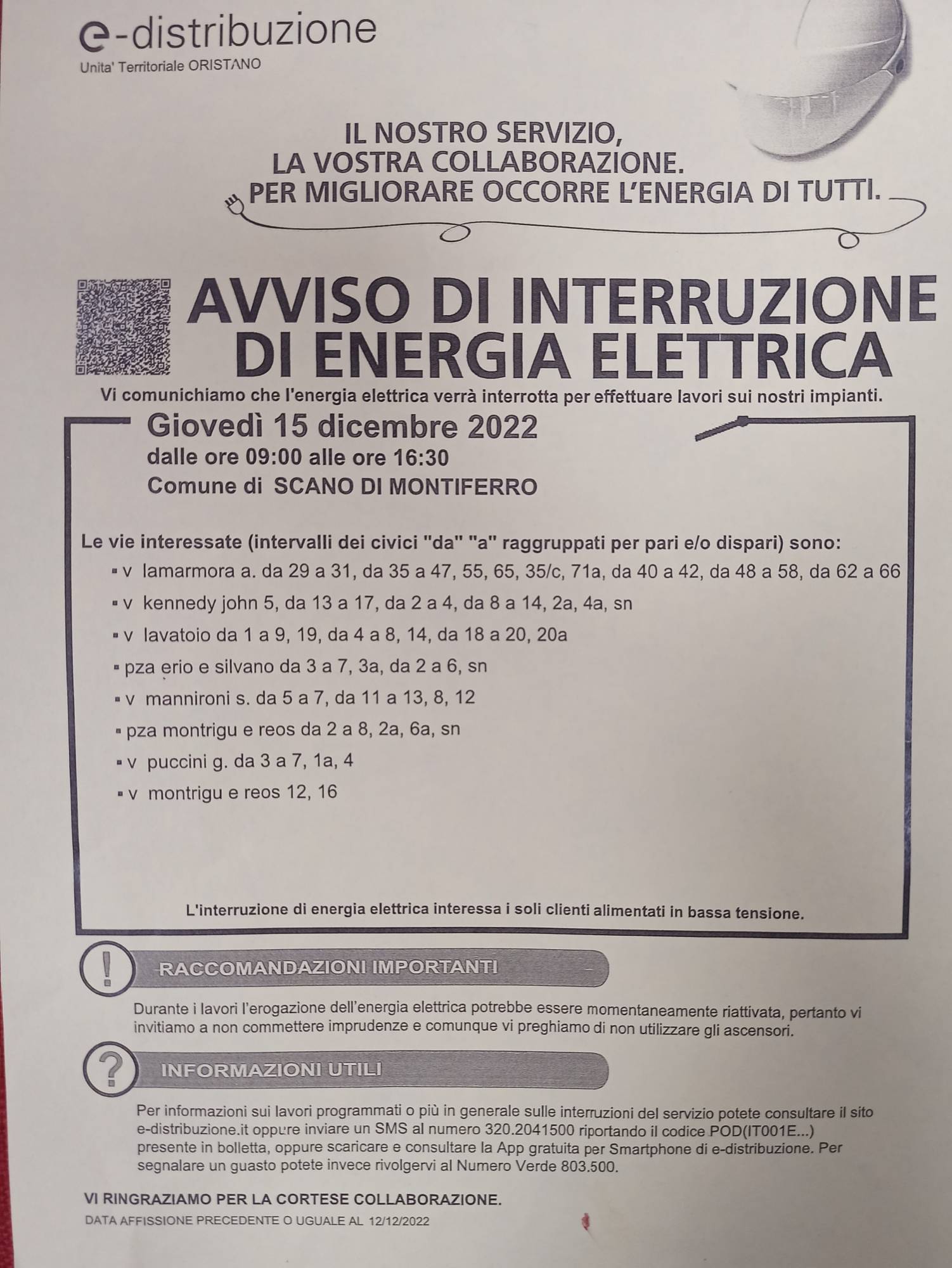Avviso di interruzione corrente elettrica Dalle ore 09:00 alle ore 16:30 13/12/2022 - Ufficio Polizia Municipale Si rende noto che in data odierna dalle ore 09:00 alle ore 16:30 per lavori urgenti sulla rete elettrica verrà interrotta l'erogazione.