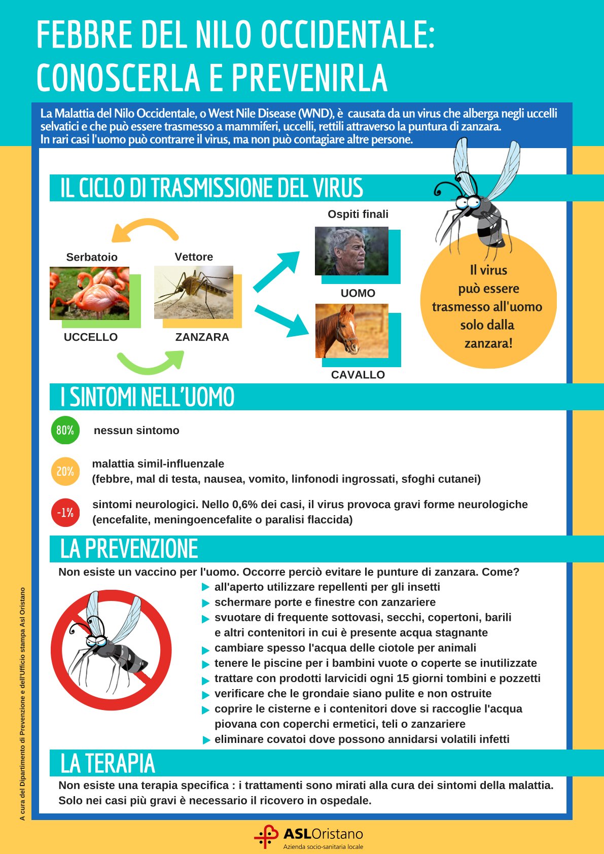 La Febbre del Nilo (West Nile Disease) è una malattia infettiva di origine virale non contagiosa trasmessa da insetti vettori (diverse specie di zanzare). L’uomo viene infettato attraverso la puntura di zanzare infette che hanno assunto a loro volta il virus da uccelli. Le zanzare compiono gran parte del loro ciclo biologico nell’acqua e, poiché non si allontanano molto dal focolaio di origine, è bene evitare la formazione di piccoli accumuli d’acqua dove esse possono deporre le uova e sviluppare le larve attenendosi alle raccomandazioni su riportate.