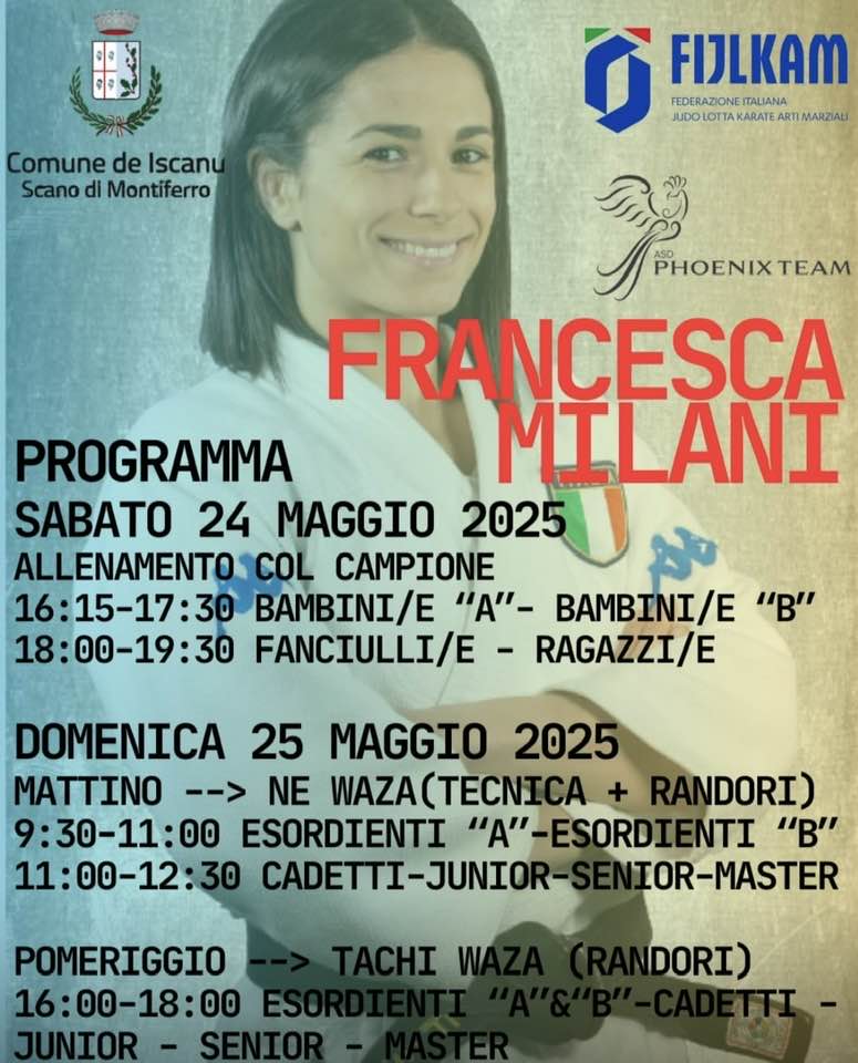 Due giornate di judo sotto la guida tecnica dell’atleta Francesca Milani, pluricampionessa italiana e olimpionica a Tokio 2020. Il Sabato saranno protagonisti i bambini dai 4 agli 11 anni con attività di giochi, percorsi e combattimenti, mentre la Domenica sono previste due sessioni tecniche rivolte agli agonisti. All’evento parteciperanno numerose società di Judo provenienti da tutta la Sardegna.