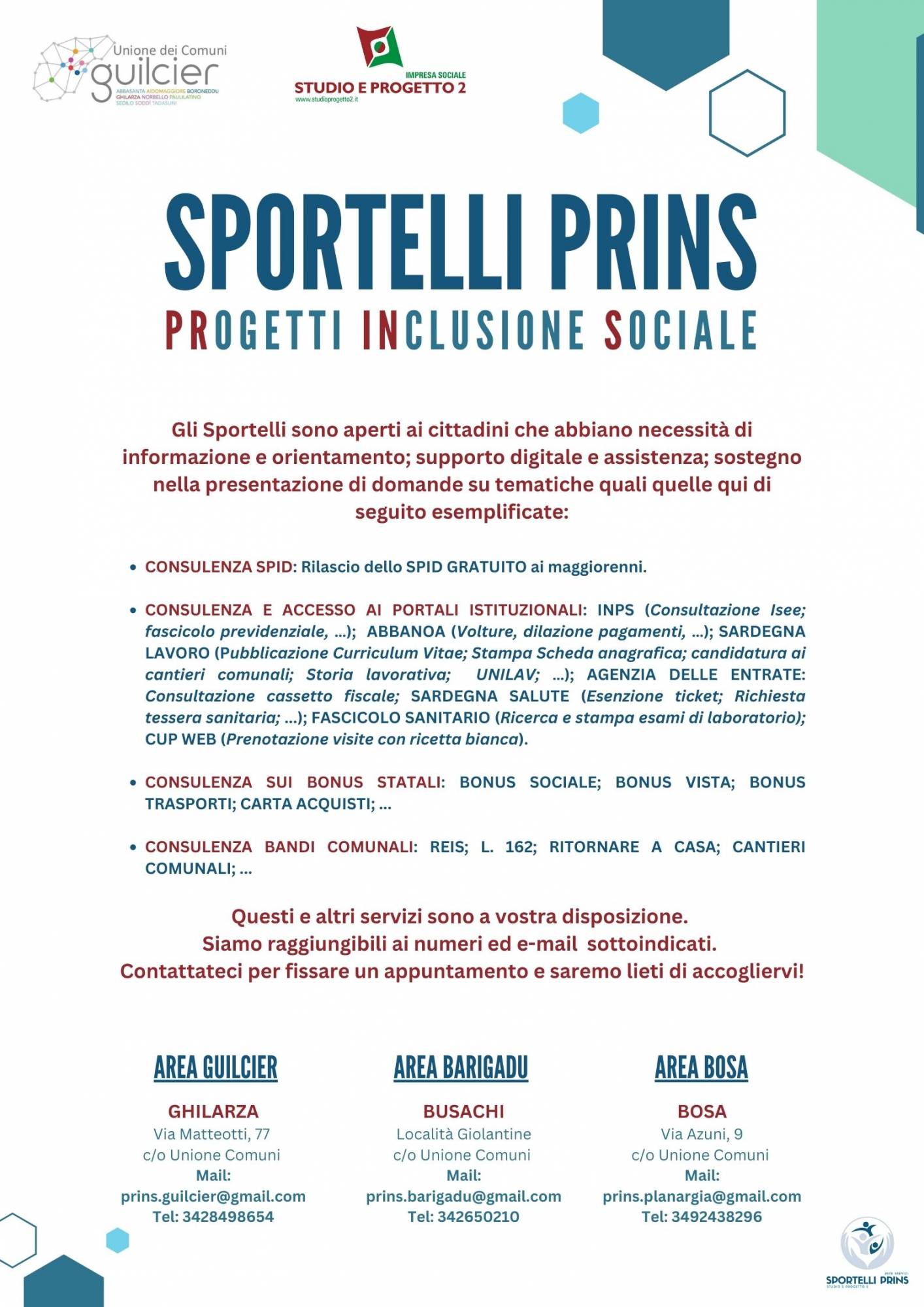 17/08/2023 - Ufficio Servizi SocialiL’Unione dei Comuni del Guilcer in collaborazione con l’impresa sociale Studio e Progetto 2, mettono a disposizione dei cittadini il servizio: “SPORTELLI PRINS: PROGETTI – INCLUSIONE - SOCIALE”.