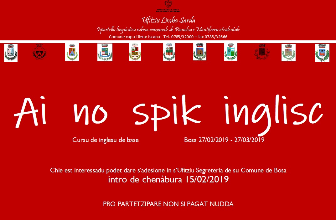 S'Ufìtziu Limba Sarda est aparitzende unu cursu de inglesu pro printzipiantes, de fàghere in Bosa dae su 27/02/2019 a su 27/03/2019.