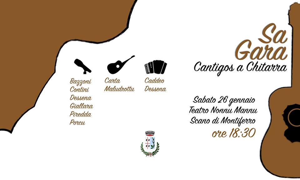 S'Assessoradu a sa Cultura bos invitat a partetzipare a sa gara de càntigos a chitarra chi s'at a fàghere sàbadu 26/01/2019 a sas 6 e mesa de sero (h 18,30) in su teatru "Nonnu Mannu".